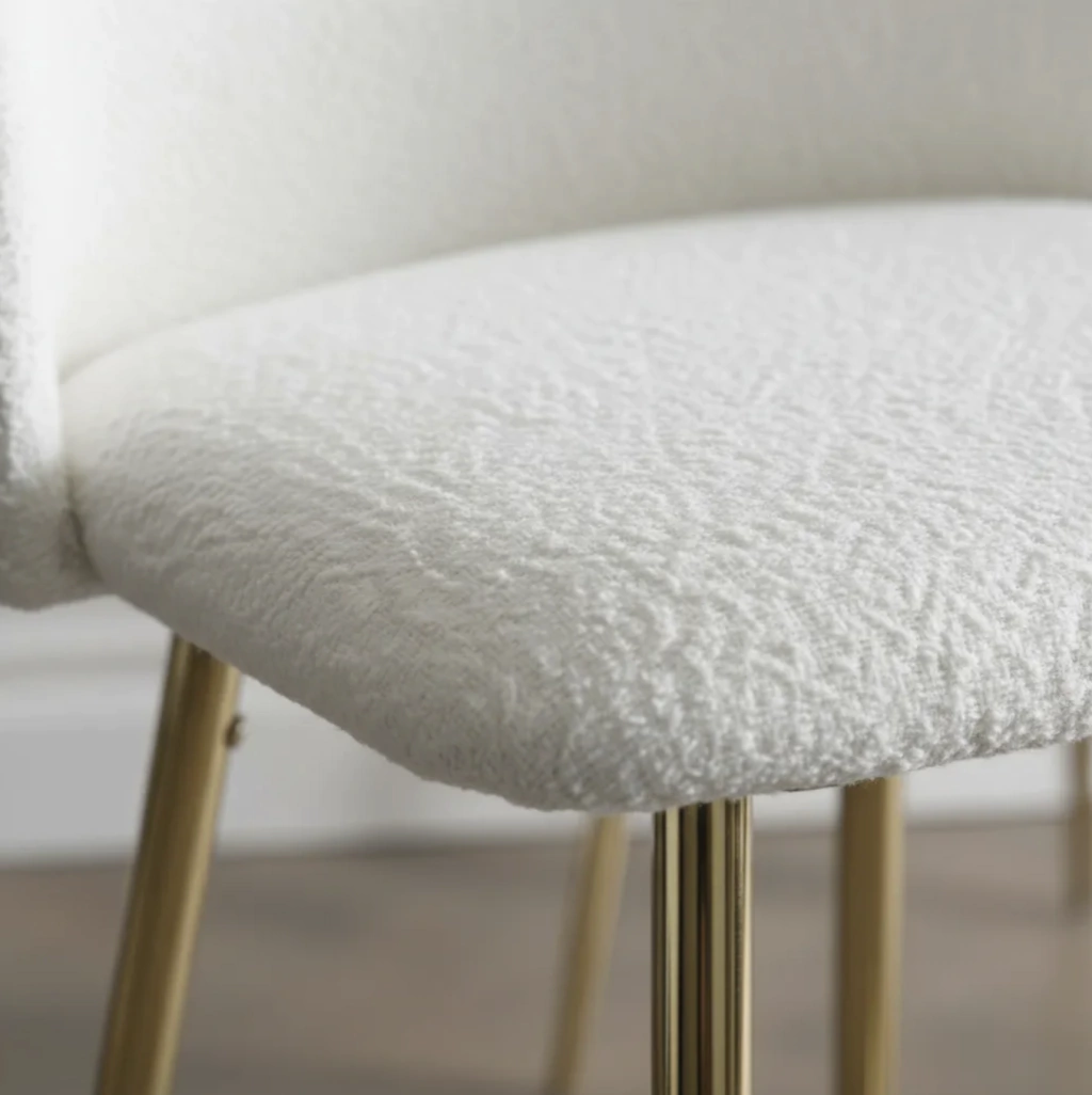 - Tapizadas en suave Bouclé Crema que aporta sofisticación.
